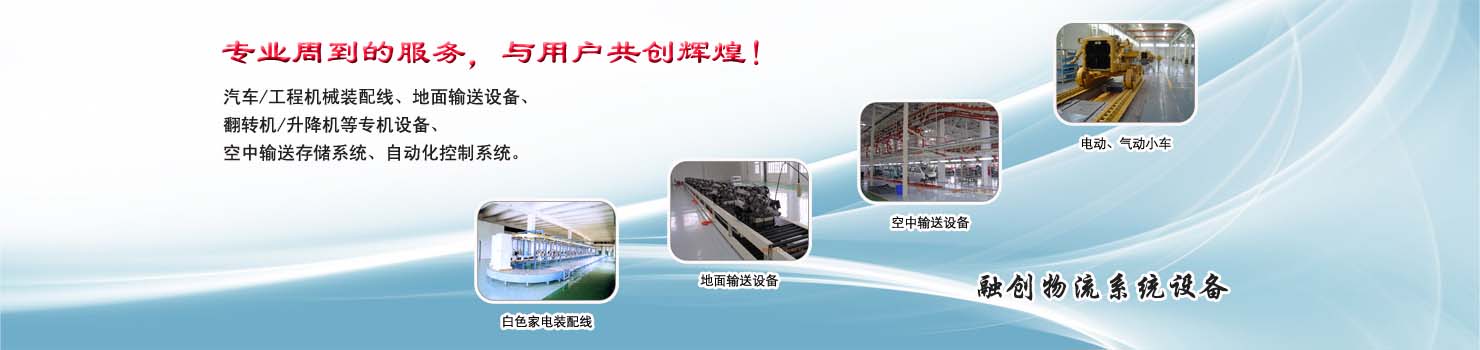 無錫市融創(chuàng)物流系統(tǒng)設備有限公司專業(yè)從事物流輸送設備、各類裝配流水線設備、各類生產(chǎn)非標專機設備和自動化控制系統(tǒng)的專業(yè)生產(chǎn)企業(yè)。廣泛應用于轎車、卡車、客車、各類工程機械、發(fā)動機、車橋、農(nóng)業(yè)機械、郵政、家電等行業(yè) ...... >> more >>